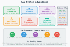 The advantages of RAG systems – real-time information access, improved accuracy, cost efficiency, and source transparency – address critical business needs across all industries. The 85% accuracy improvements and 75% customer satisfaction increases observed in RAG implementations demonstrate tangible value that justifies investment.