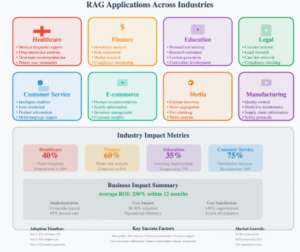 The business impact metrics demonstrate the transformative value of RAG implementations. The average ROI of 250% within 12 months reflects the combination of cost savings, efficiency improvements, and new revenue opportunities that RAG systems enable.