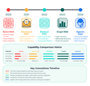 - Naïve RAG (2020) marked the beginning with simple keyword-based retrieval using traditional methods like TF-IDF and BM25. While groundbreaking in concept, these early systems struggled with semantic understanding and context integration. They were essentially sophisticated search engines bolted onto language models.